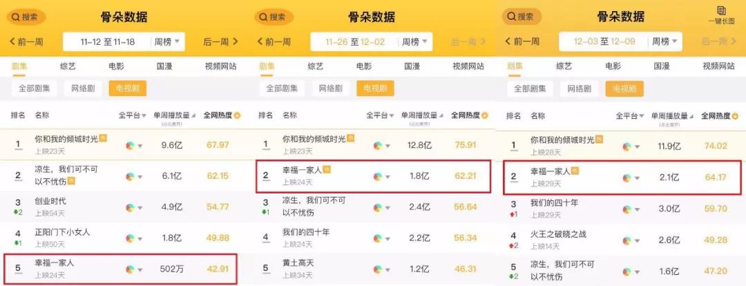 骨朵指數(shù)以在播作(zuò)品的(de)觀衆反饋、媒體(tǐ)曝光(<<$ guāng)及全網關注、熱(rè)議(yì•♦ ✘)和(hé)受衆情況,綜合評估了(le)一(yī)部作(zuò)品的(de)網$✔&絡熱(rè)度。就(jiù)其最新一(yī)周電(diàn)視(shì)↕✘ε劇(jù)周榜來(lái)看(kàn),《幸福一(yī)家☆≠(jiā)人(rén)》骨朵全網熱(rè)度蟬聯亞軍席位,>↕€較開(kāi)播首周上(shàng)升三個(gè)名§ε"©次,熱(rè)度值提升49.5%。
