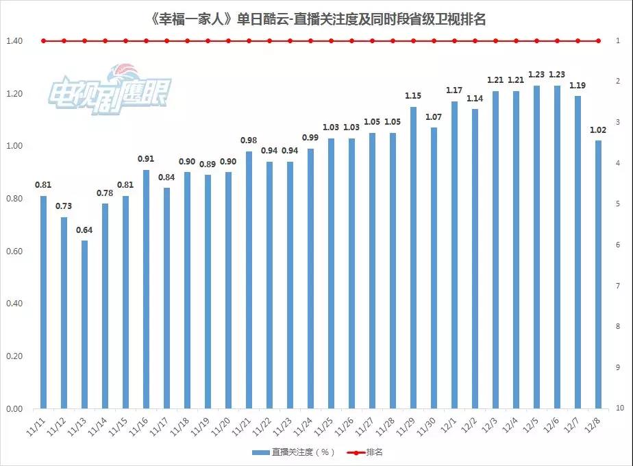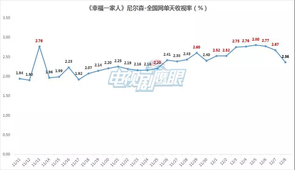 從(cóng)尼爾森(sēn)-全國(guó)網收視(shì)來(lái)看(kàn),《幸福φ↓一(yī)家(jiā)人(rén)》開(kāi)播僅三♠®™★日(rì)便創下(xià)單天收視(shì)2.76%的(de)小(xiǎo)高(gāo)潮,随後更是(shì)借“ ÷∞♣高(gāo)開(kāi)”之勢持續“高(gāo)走”,共計(jì)23天收視(shì)破2%,其中9天突破2.5%。12月(yuè)1日(rì)後,《幸福一(yī)家(jiā)人(rén)₽£》單天收視(shì)不(bù)僅持續達到(dào)2.3%以上(shàng),更是(shì)蟬聯央衛視(shì)晚間(jiān)劇(jù)場(chǎng)收視(shì)冠 ± 軍,穩固霸主地(dì)位。