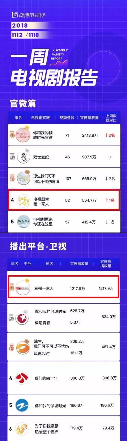 在播出期間(jiān),《幸福一(yī)家(jiā)人(rén)》通(♦λtōng)過短(duǎn)視(shì)頻(pín)提升劇(jù)集的(d>≥e)滲透率,由微(wēi)博電(diàn)視(shì)劇(jù)推出的(de∞∑)“一(yī)周電(diàn)視(shì)劇(jù)報(bào)告”顯示¥♦,《幸福一(yī)家(jiā)人(rén)™®'》在開(kāi)播首周便以554.7萬的(de)官微(wēi)視(shì)頻(pín)播放(fàng)量沖φφ≠>上(shàng)第四席位。與此同時(shí),該劇(jù)幫助北(běiφα<)京衛視(shì)官微(wēi)拿(ná)下λ≥(xià)播放(fàng)量冠軍,累計(jì)達1217.9萬,是(shì)第二名的(de)近(jìn)兩倍。