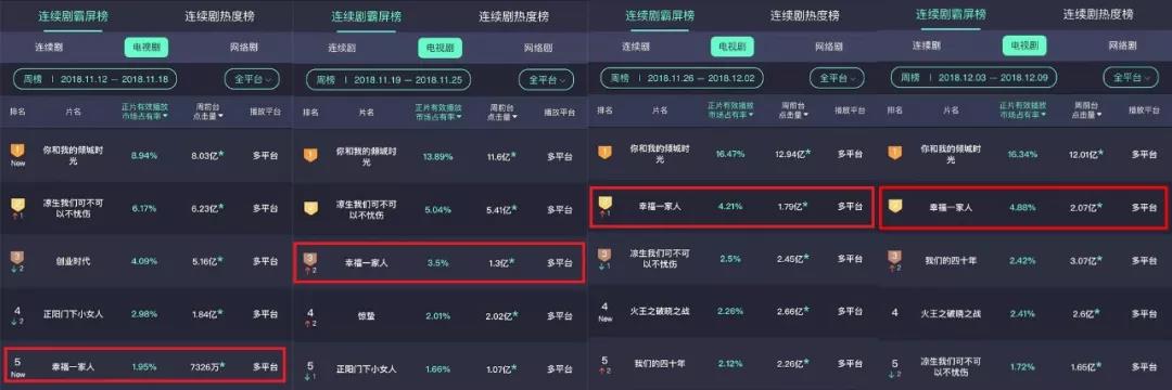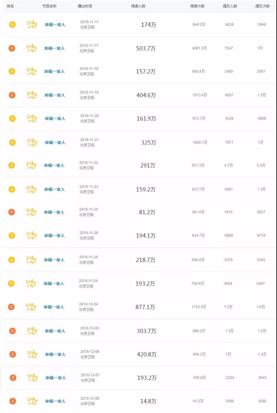 據微(wēi)博電(diàn)視(shì)劇(jù)顯示,《幸福一(yī)家(α'•jiā)人(rén)》在開(kāi)播首日(rì)★♠便強勢空(kōng)降至季軍席位,共計(↓&jì)17天進入電(diàn)視(shì)劇(jù)日(rì)榜前三←Ω,單日(rì)閱讀(dú)人(rén)數✘♣∑♣(shù)最高(gāo)達877.1萬,閱讀(dú)次數(shù)最高(gāo)§•達4061.5萬,提及人(rén)數(shù)最高(gāo)達4.7萬,提及次數(shù)最高(gāo)達5.4萬。